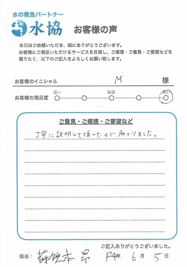 今回ご相談したトイレ以外の不安要素も解消していただいて安心致しました。本当にありがとうございます。